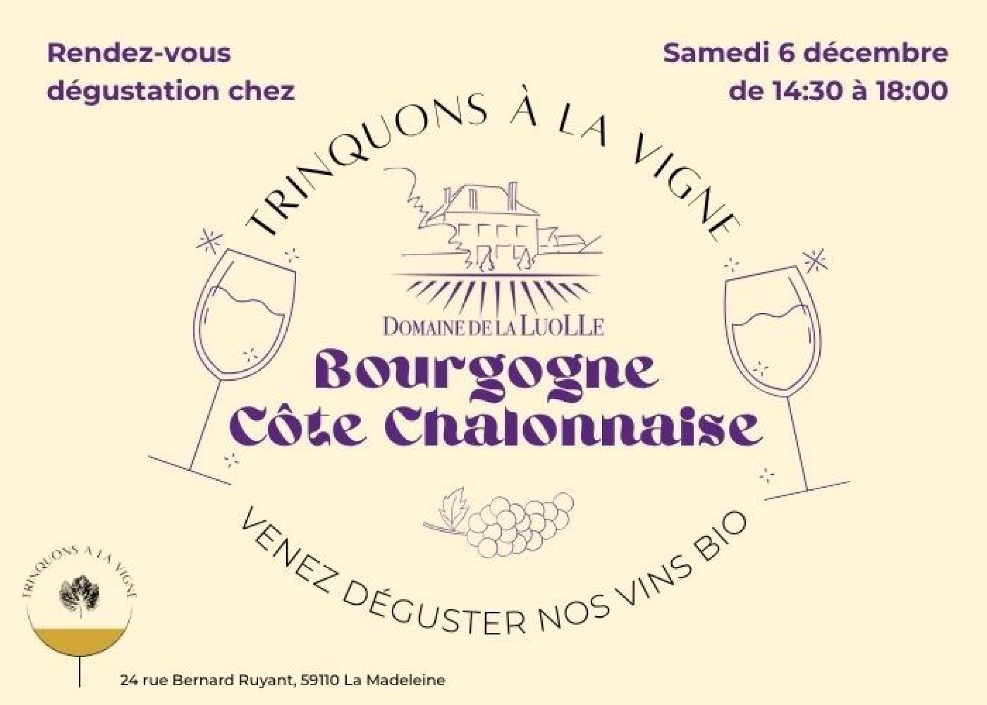 Venez déguster nos vins bio de Bourgogne Côte Chalonnaise 2 soirées gourmandes accords mets & vins Au Comptoir de Catherine – Bersée 03 20 84 17 25 Jeudi 4 décembre 19h30 Au Club Marot – Lille 03 20 57 01 10 - vendredi 5 decembre 19h30